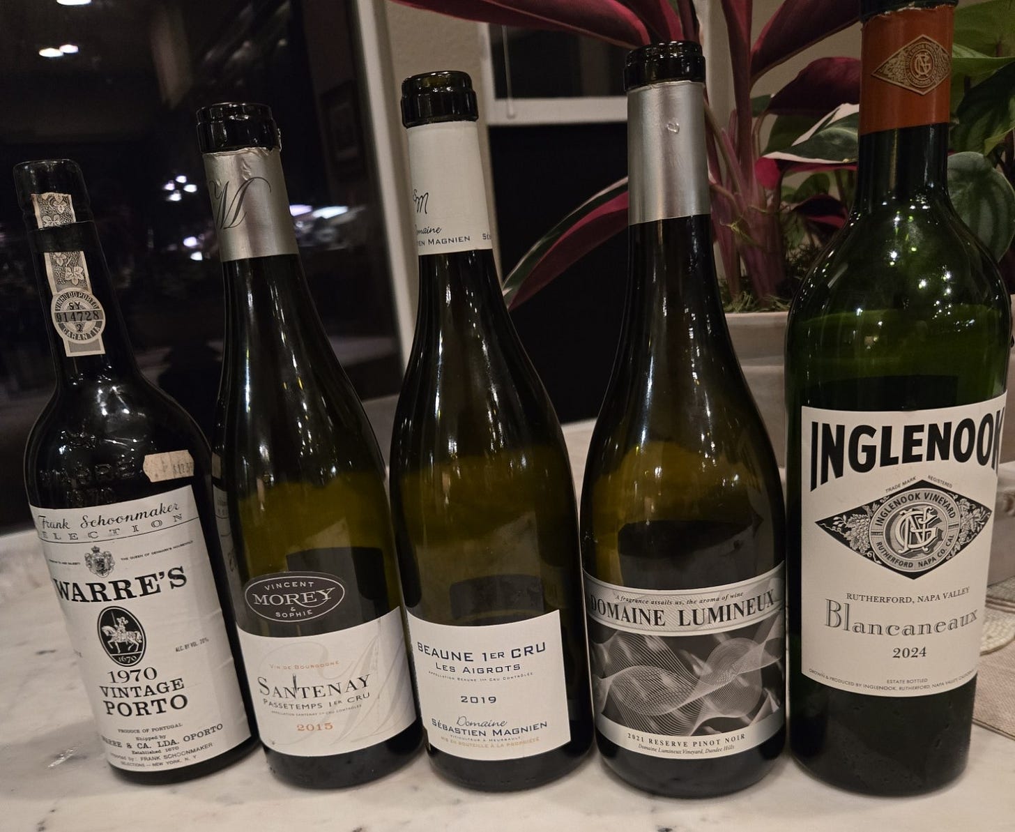 At a pre-Christmas celebration with friends, we enjoyed a number of things, including an unphotographed magnum of Ashes and Diamonds Cabernet Sauvignon, which was dynamite. But another Napa wine made a great impression – this 2024 Inglenook “Blancaneaux” bottling of Marsanne, Roussanne, and Viognier was WAY better than I expected, and one of my new all-time favorites. Dry, highly complex, easy on the marzipan, and very lightly oaked. Hand-carried to the party by its winemaker, Jonathan Tyer, along with some impressive Oregon Pinot Noir.